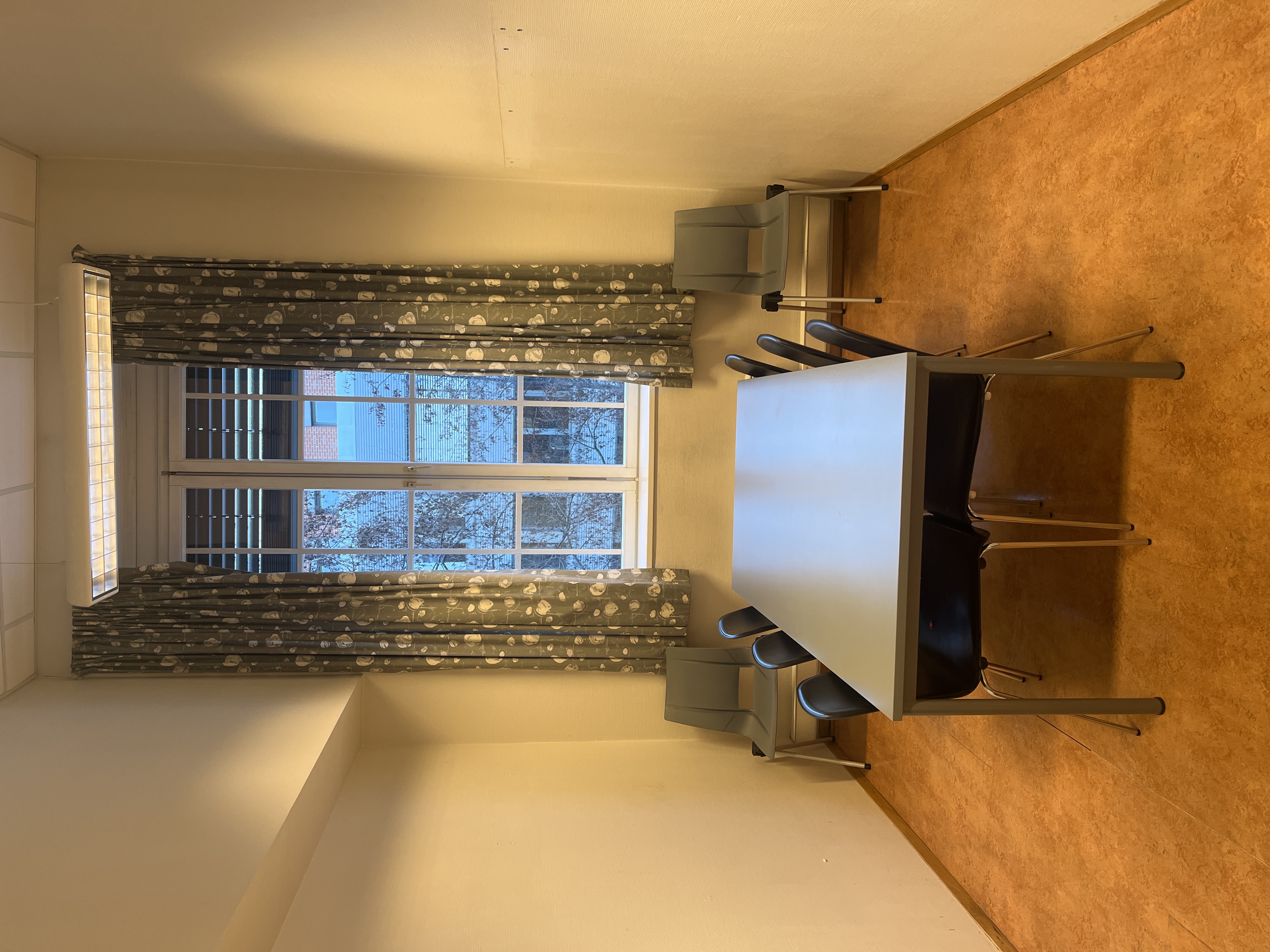 Ulåst rom/Unlocked room. Rommet har ikke QR-kode for skanning av tilstedeværelse innen 15 minutter etter oppstart. Rommet kan bookes for fire timer om gangen.